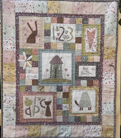 Hatched and Patched Time to Daydream. This sweet little quilt could be made as a wall hanging or as a quilt for a pram or bassinet. It combines applique with stitchery and the pattern has the added bonus of the alphabet and number 0-9, so you can embroider the name, birth-date, and weight of the new person in your life.