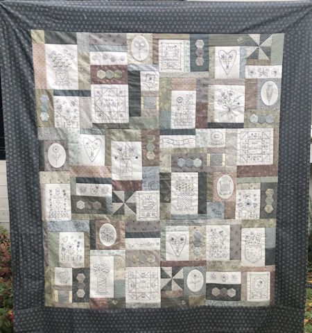 Gail Pan Bloom and Sew  is a six part Block of the month with Embroidered flowers and English Paper Piecing for you to make each month. The finished size is 50″ x 55″
