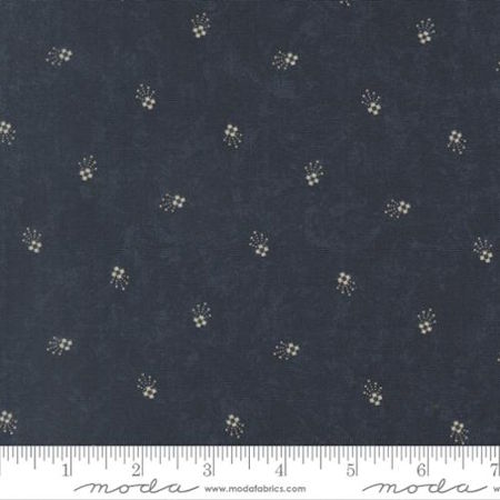 Moda Bluebirds Nest Comet Blenders Dark Blue Cotton Fabric by Kansas Troubles. This is a dark blue fabric background with a small cream design . It is 44″ wide, 100% cotton Fabric.