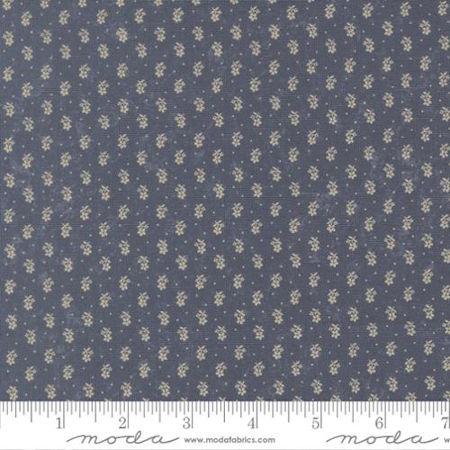Moda Bluebirds Nest Tiny Buds Small Floral in Mid Blue Cotton Fabric by Kansas Troubles. This is a mid blue fabric background with small cream Buds and flower design . It is 44″ wide, 100% cotton Fabric.