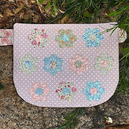 Featuring a cute stitchery design on the front, English Paper Pieced hexagons on the back in pretty florals.