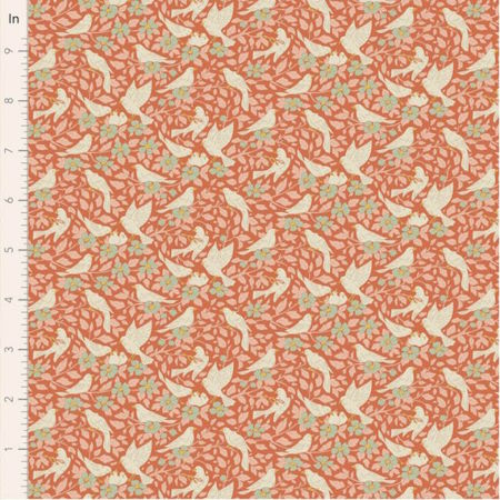 Tilda Songbird Ava Coral features a print of beautiful cream birds and flowers on a coral background.