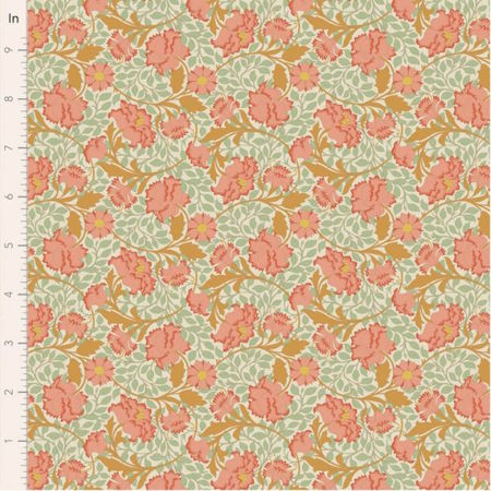Tilda Songbird Floral Coral features a gorgeous print of coral flowers and green leaves on a cream background.