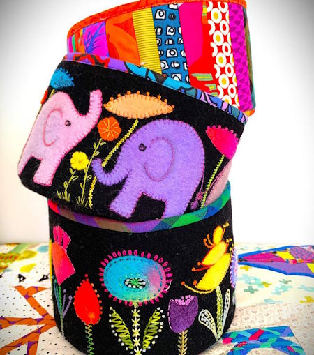 Flying Fish Sri Lankan Baskets by Wendy Williams. These are wool applique and there are 3 sizes for you to make. Small 4″ x 19″,  medium  4″ x 22″ and 4″ x 24″.