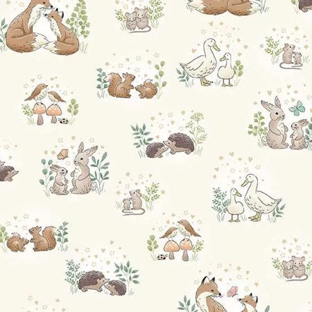 Makower Little Ones Hugs Cream Novelty Cotton Fabric. This is a cream fabric background with litle woodland animals scattered on the background. It is 100% cotton fabric, 44″ wide